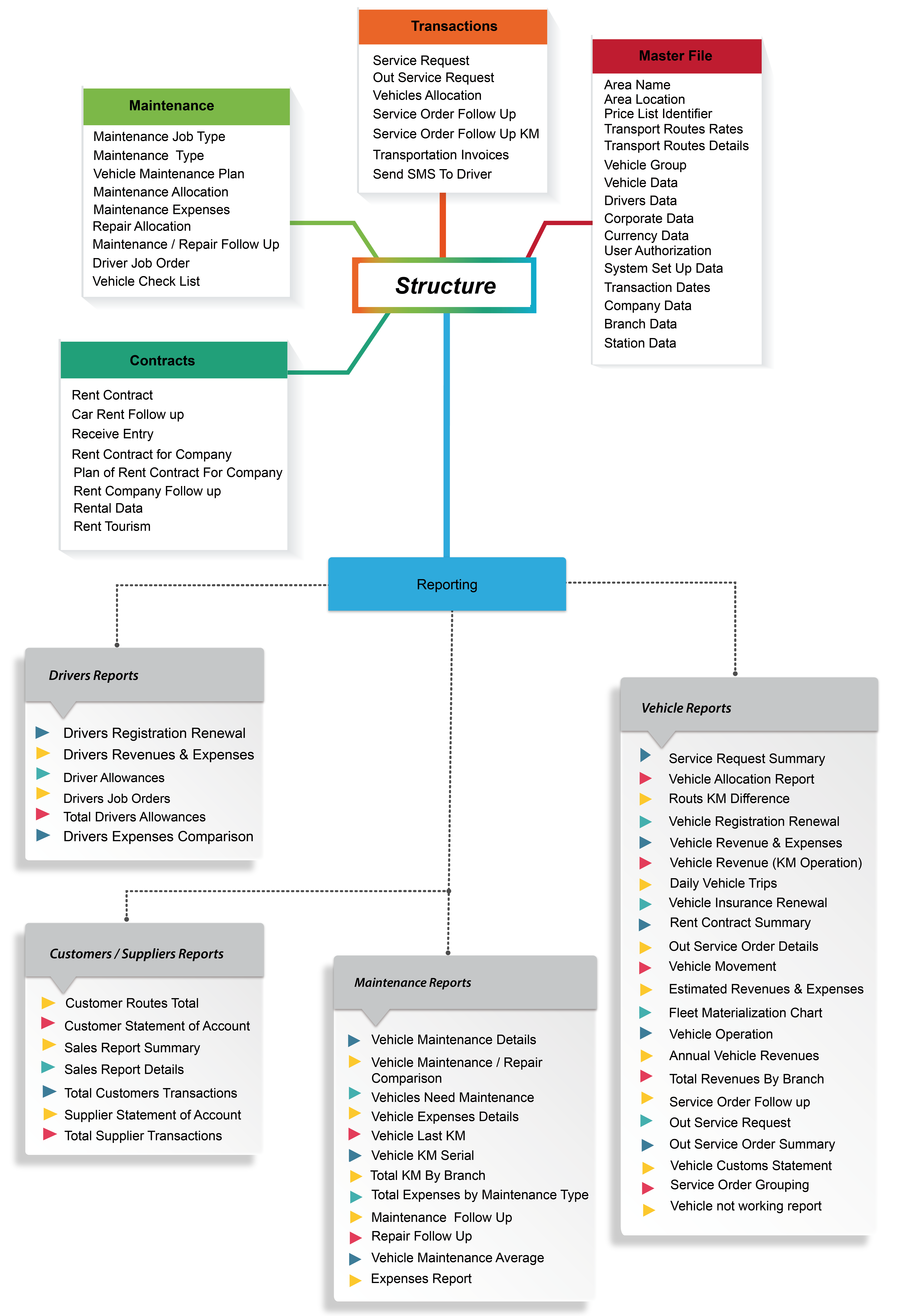 A powerful computer software system, Handling carefully your transport operation department activities and all transport routs rates, Vehicle information & Allocations, Drivers details, Service request & Out service request, Vehicle maintenance & Repair and Car rent contracts